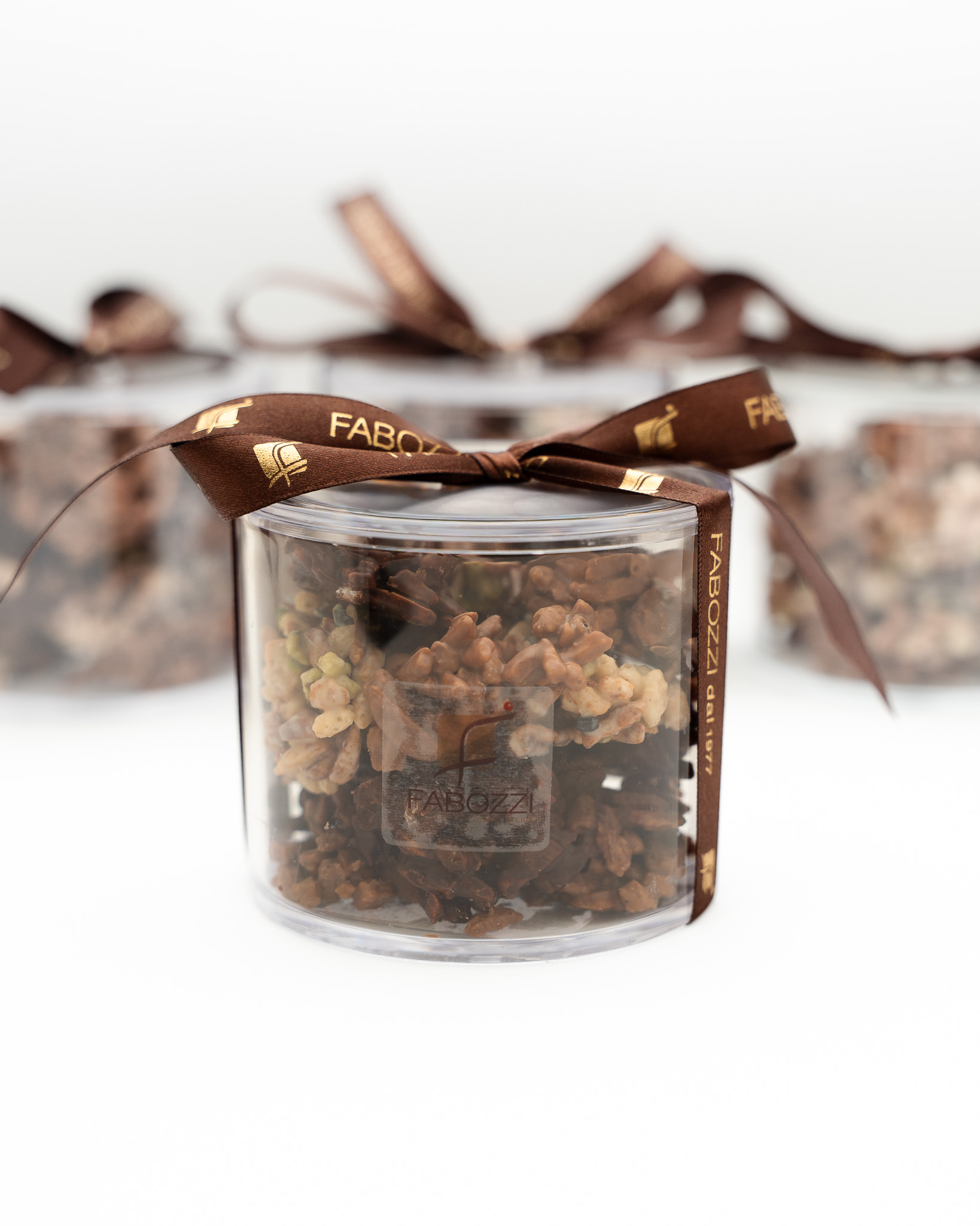Mandorle dolci pelate affettate, cioccolato finissimo al latte (cacao minimo 32%) [zucchero, burro di cacao, latte in polvere, pasta di cacao, siero di latte in polvere, emulsionante: lecitina di soia, aroma naturale di vaniglia], zucchero, acqua, chicchi di riso soffiato con vitamine, chicchi di caffè [zucchero (54,6%), massa di cacao (35%), burro di cacao (8,9%), olio di girasole, aroma al caffè, vaniglia], cioccolato bianco al caramello.